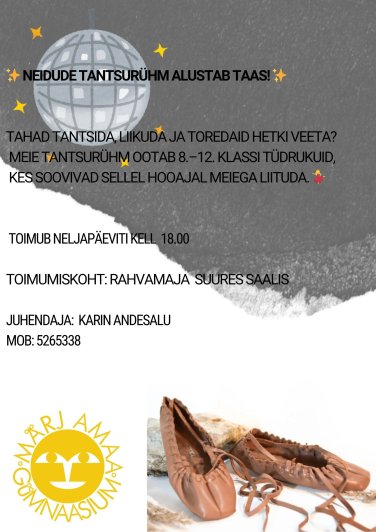 Ootame rõõmsaid ja tegusaid 8.–12. klassi tüdrukuid, kes tahavad liikumise ja muusika kaudu energiat ja enesekindlust koguda.