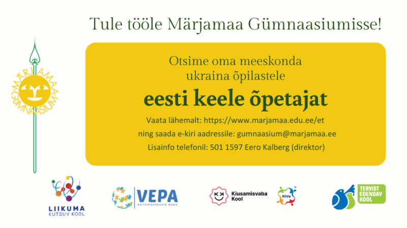 Märjamaa Gümnaasiumis 2024/2025 õppeaasta alguses 19 Ukrainast saabunud õpilast pea igast vanusest (2.-11. kl). Oleme võtnud nad vastu avatud südamega ja jaotanud kooliastmete järgi nelja gruppi, kellest kolmele - põhikooli lastele - otsime eesti keele õpetajat. Igale vanuseastmele plaanime viia läbi ühe eesti keele tunni päevas, seega peaks 3-tunnine töökoormus sobima hästi mõnele teisele tegevusele lisaks. Kui tunned, et oskad ja soovid appi tulla, anna palun endast märku.