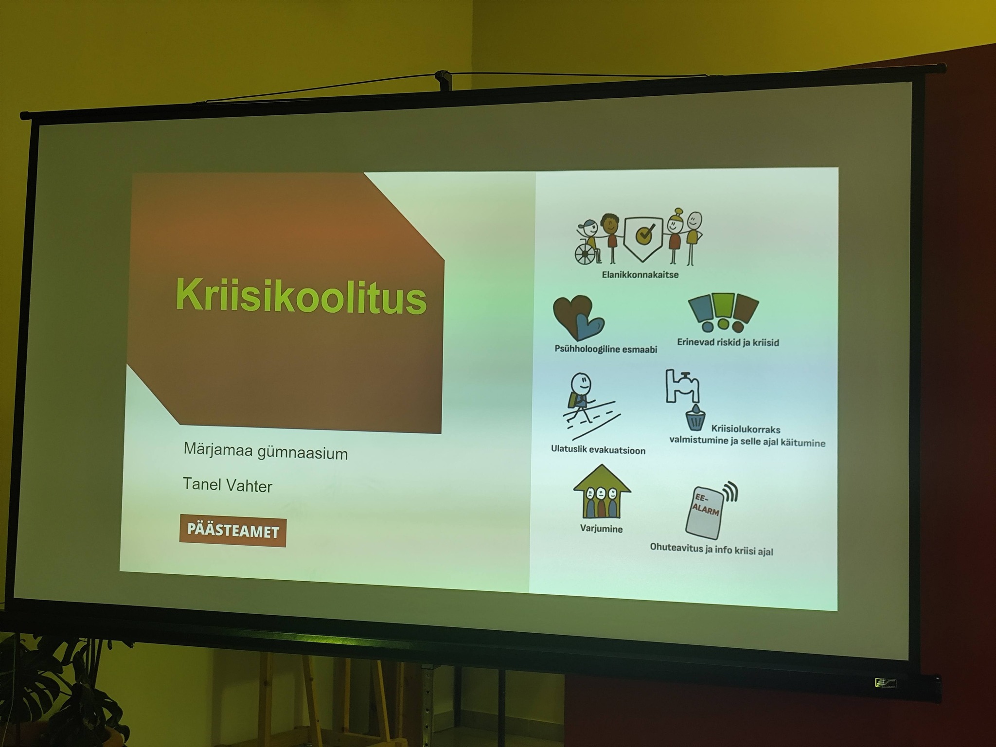 Neljapäeval koguneti kooli sööklasse, kus päev algas Päästeameti koolitusega. Tanel Vahter näitas slaidiprogrammi, mis keskendus eriolukordades käitumisele, kriisiplaani täitmisele, teavitussüsteemidele ning varjumise tähendusele. Lisaks teooriale said õpetajad osaleda seitsmes erinevas töötoas, kus grupitööna lahendati praktilisi ülesandeid. Koolitus osutus väga harivaks ning aitas paljusid teemasid paremini mõista.