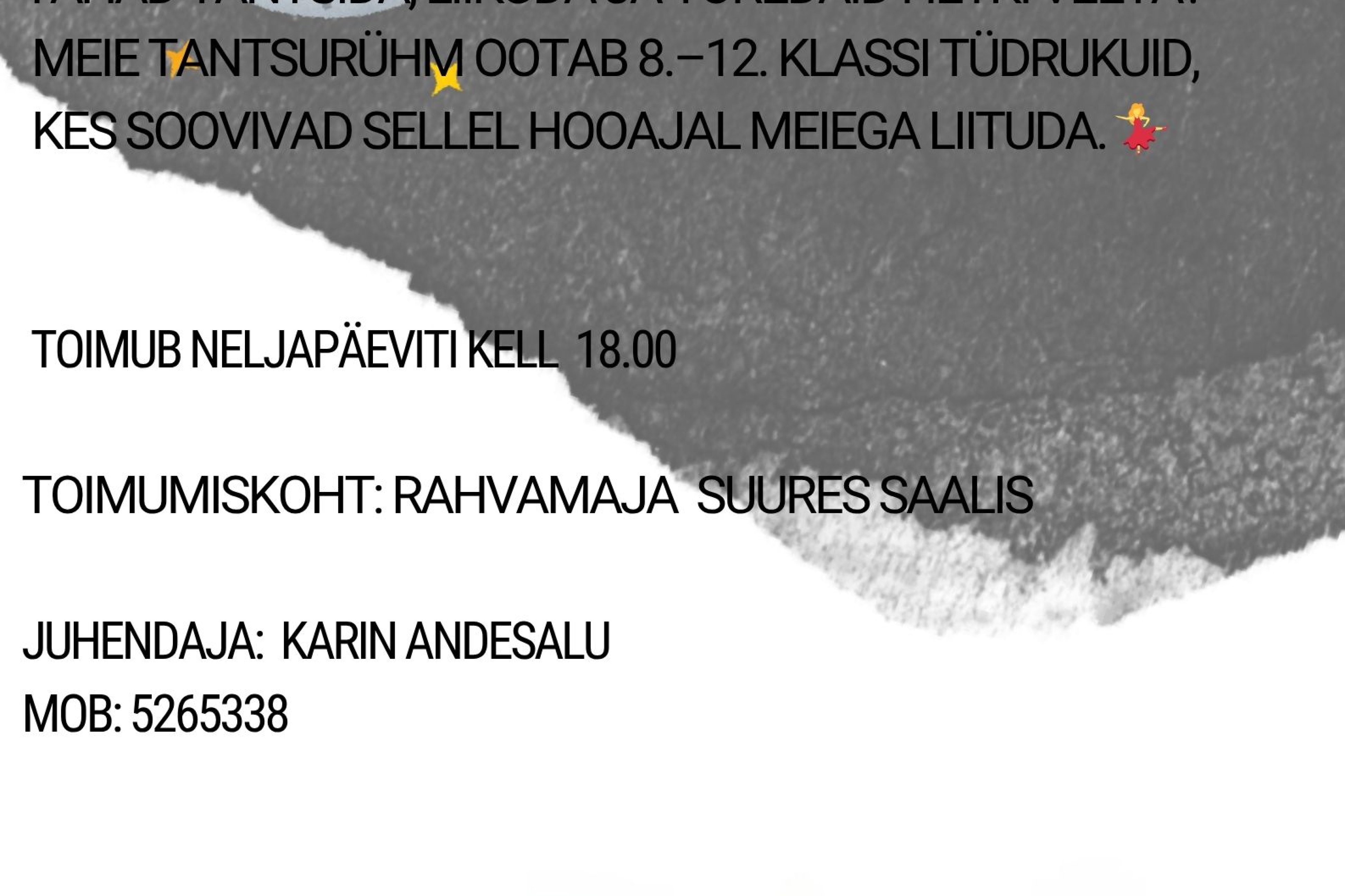 Ootame rõõmsaid ja tegusaid 8.–12. klassi tüdrukuid, kes tahavad liikumise ja muusika kaudu energiat ja enesekindlust koguda.