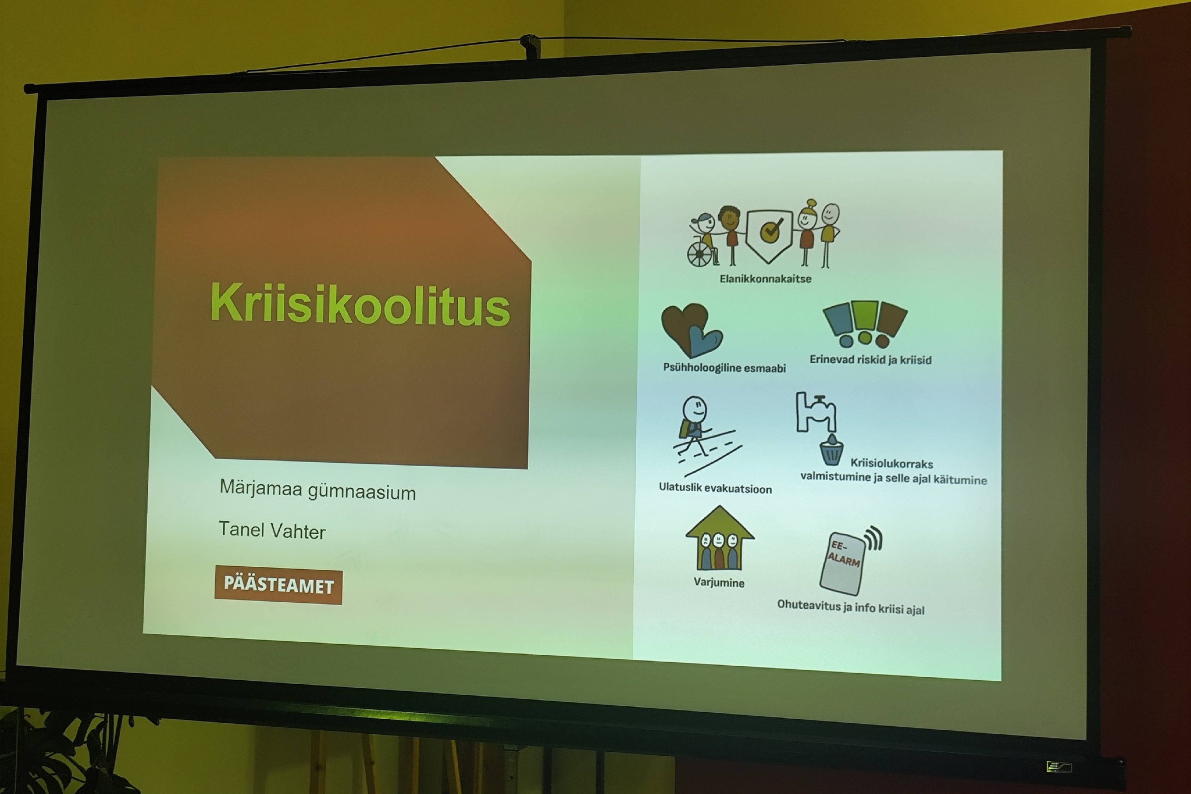 Neljapäeval koguneti kooli sööklasse, kus päev algas Päästeameti koolitusega. Tanel Vahter näitas slaidiprogrammi, mis keskendus eriolukordades käitumisele, kriisiplaani täitmisele, teavitussüsteemidele ning varjumise tähendusele. Lisaks teooriale said õpetajad osaleda seitsmes erinevas töötoas, kus grupitööna lahendati praktilisi ülesandeid. Koolitus osutus väga harivaks ning aitas paljusid teemasid paremini mõista.